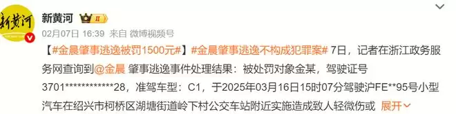 2月7日,网友查询到金晨肇事逃逸事件的处理结果是,金晨被罚款1500元。