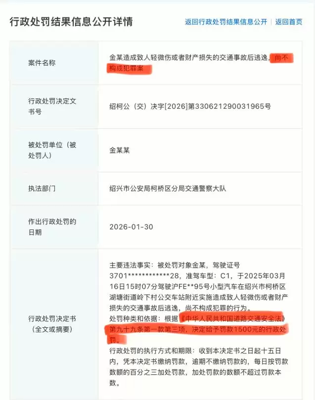 金晨因在2025年3月驾车发生交通事故后离开现场,于是被认定“肇事逃逸”,最终处以金晨1500元行政罚款,时隔一年的处罚,直接打脸洗白的粉丝,直到现在,金晨的粉丝还在喊冤,说什么金晨不是逃逸,而是紧