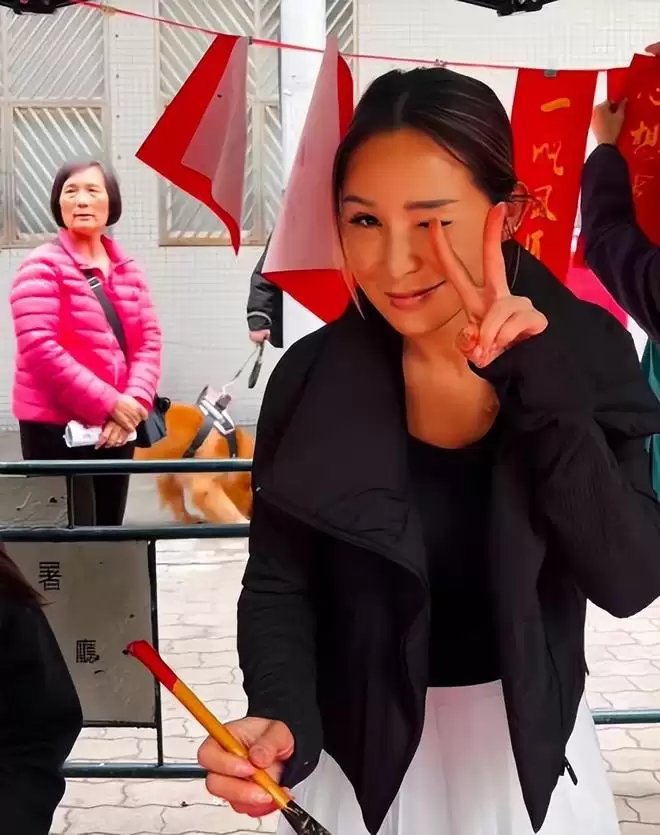 如今她和女儿回港低调写春联,与昔日富贵形象大相径庭。