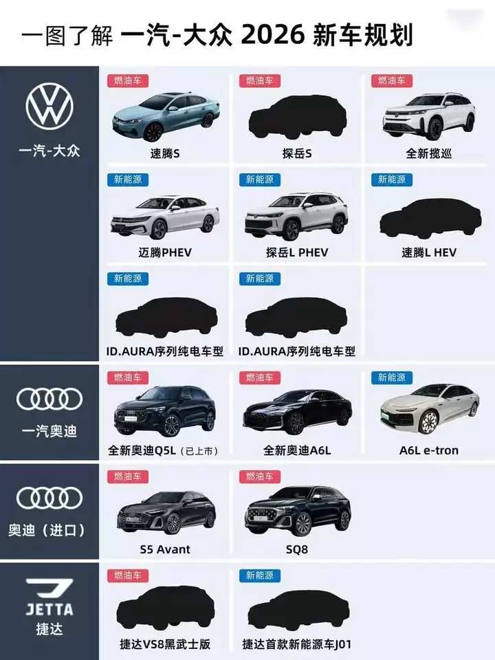 另外,2026年,大众也在产品方面动了刀,将向中国市场投放超20款新能源车型,覆盖多个细分市场,并继续推进“油电同智”战略。
