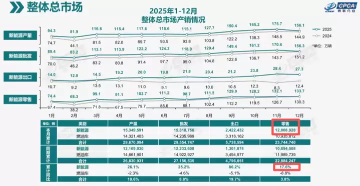 销量变化背后,一个更深层的结构性问题凸显。中国新能源车2025年累计零售1280.9万辆,同比增长17.6%,且售渗透率一度达到59.1%,但大众就是没有接住这波红利,还是靠着超过250万辆的燃油车,守着基本盘。
