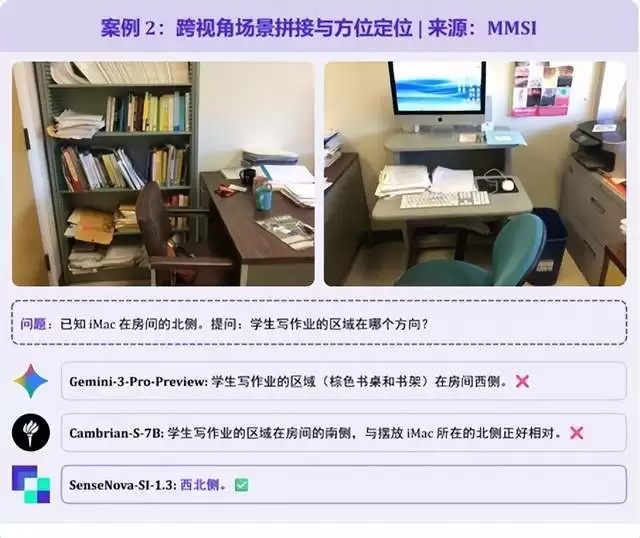 题目给出两张书房局部照片,已知 iMac 位于房间北部,询问学生写作业区域的方位。需先理解两张图片属于同一空间,再通过视觉线索拼接场景。Gemini-3-Pro误判学习区在西侧;SenseNova-SI-1.3精准定位 “西北角”,完全符合空间逻辑。