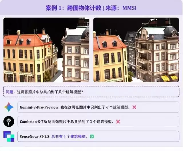题目要求统计两张照片中建筑模型的总数量,核心难点是理解两张图的对应关系,以此避免遮挡漏数和重复多数。图2视角下显现出图 1 中被遮挡的深灰色建筑,且部分模型在两图中重复出现。Gemini-3-Pro未完全去重,误数为 6 个;SenseNova-SI-1.3则给出 “4 个”的准确答案。