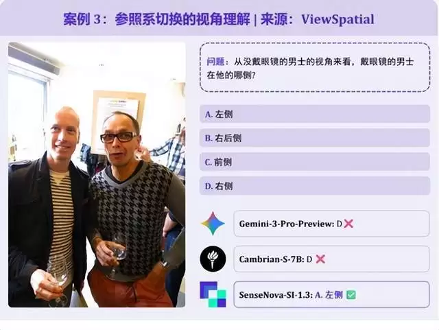 题目要求以 “未戴眼镜男士的自身视角” 判断身旁戴眼镜男士的方位,考察 “参照系转换” 能力,模型很容易以“观察者视角”来判断方向。Gemini-3-Pro就误选了 “右边”;SenseNova-SI-1.3则能正确给出 “左边” 的正确答案。