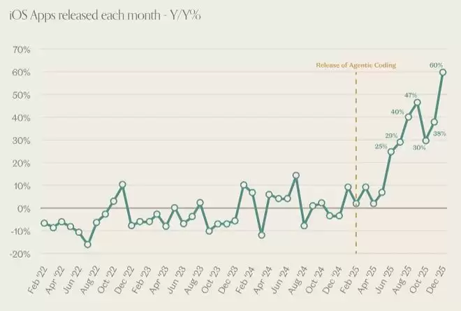 氛围编码正在走向主流。在近三年的持平增长之后,12月新应用上线同比跃升 60%。