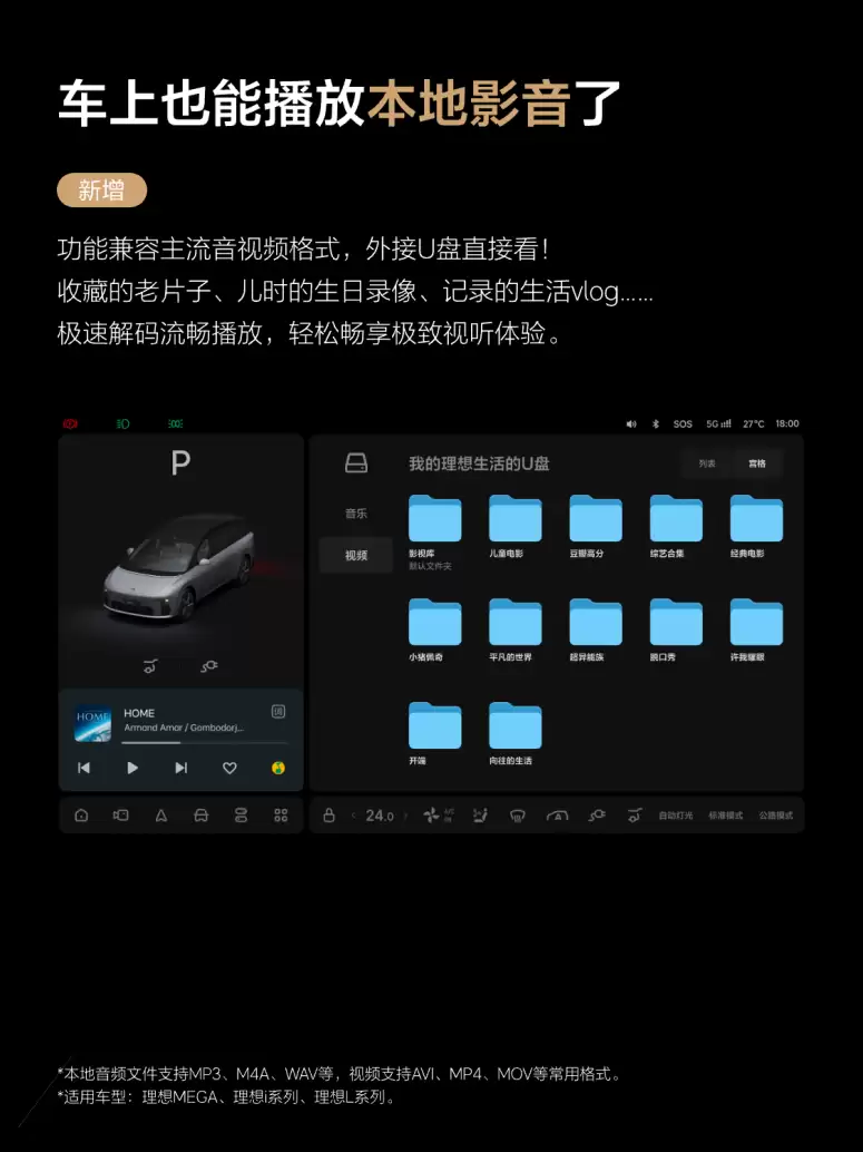 智能座舱围绕“移动影音厅”概念进行了影音娱乐功能的升级,让家人的团圆时光更加丰富多彩。升级后车机支持播放本地影音文件,用户可以播放U盘中的影音内容。车辆兼容主流音视频格式,并能够极速解码、流畅播放,带来极致的视听体验。“任务大师”增强了场景判断和执行能力,新增“音频播放完成时”等条件,支持判断“理想新鲜事”、“理想对话间”等内容是否播放完毕,也支持判断宠物模式是否开启。同时,“任务大师”还支持通过“理想同学”语音指令静默执行“我要唱歌”、“播放音乐”、“刷新地图”等一系列便捷操作。
