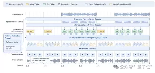 在MiniCPM-o4.5中,面壁团队首次引入了全双工(Full-Duplex)多模态实时流机制。模型可以一边持续接收视频和音频输入,一边同步生成语音或文本输出,两条信息流并行运行,互不阻塞。