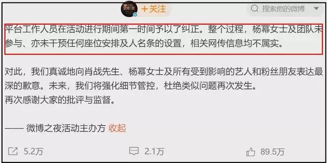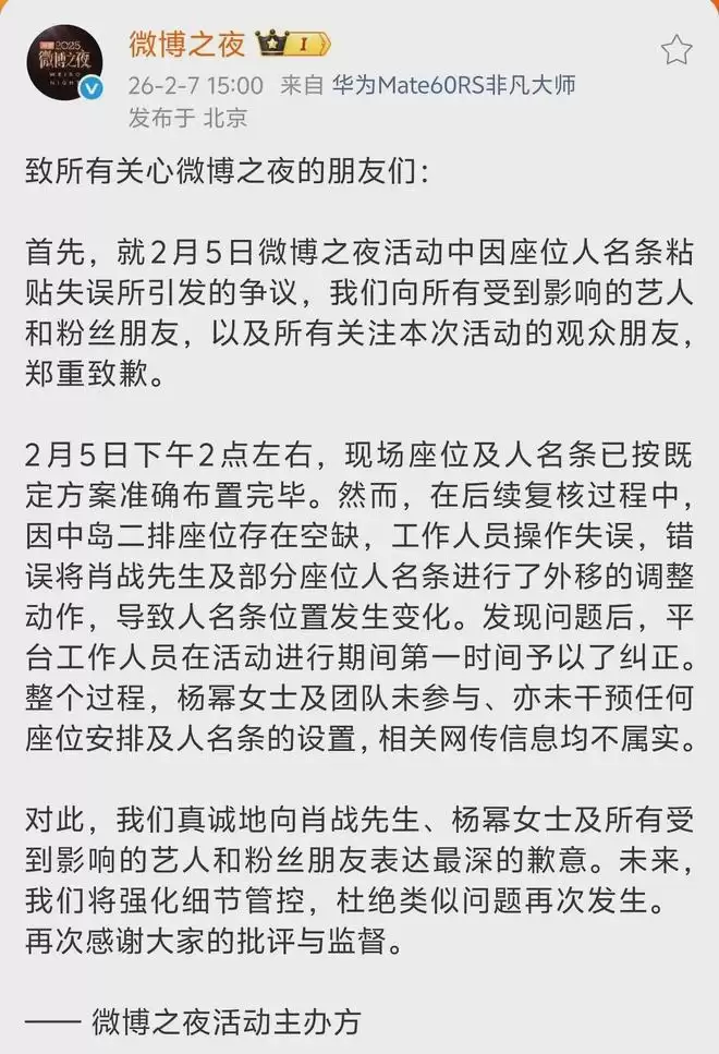 相比较之前较为模糊的致歉声明,微博之夜活动主办方最新声明清晰点出了两位明星的名字,正是肖战、杨幂,同时承认了座位争议给出席微博之夜的明星和粉丝都带来了影响。