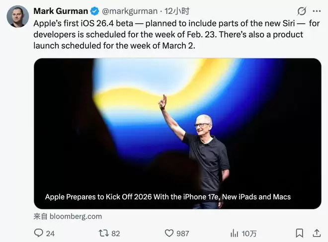 彭博社消息:iOS 26.4内测在即,iPhone 17e或于下月发布