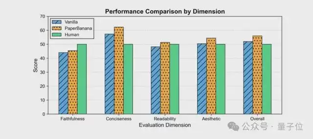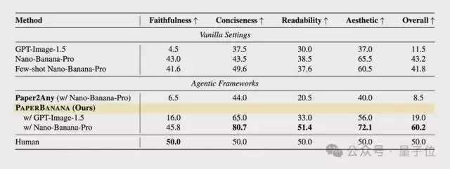 而实验结果表明,PaperBanana在所有维度上全面超越了传统的单模型直接生成(Vanilla)等基线方法。