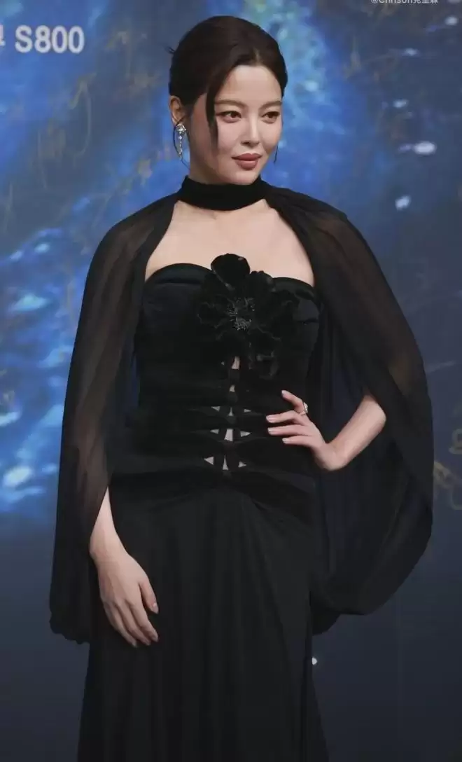 杨幂缎带长裙、黑发红唇造型被赞优雅贵气。