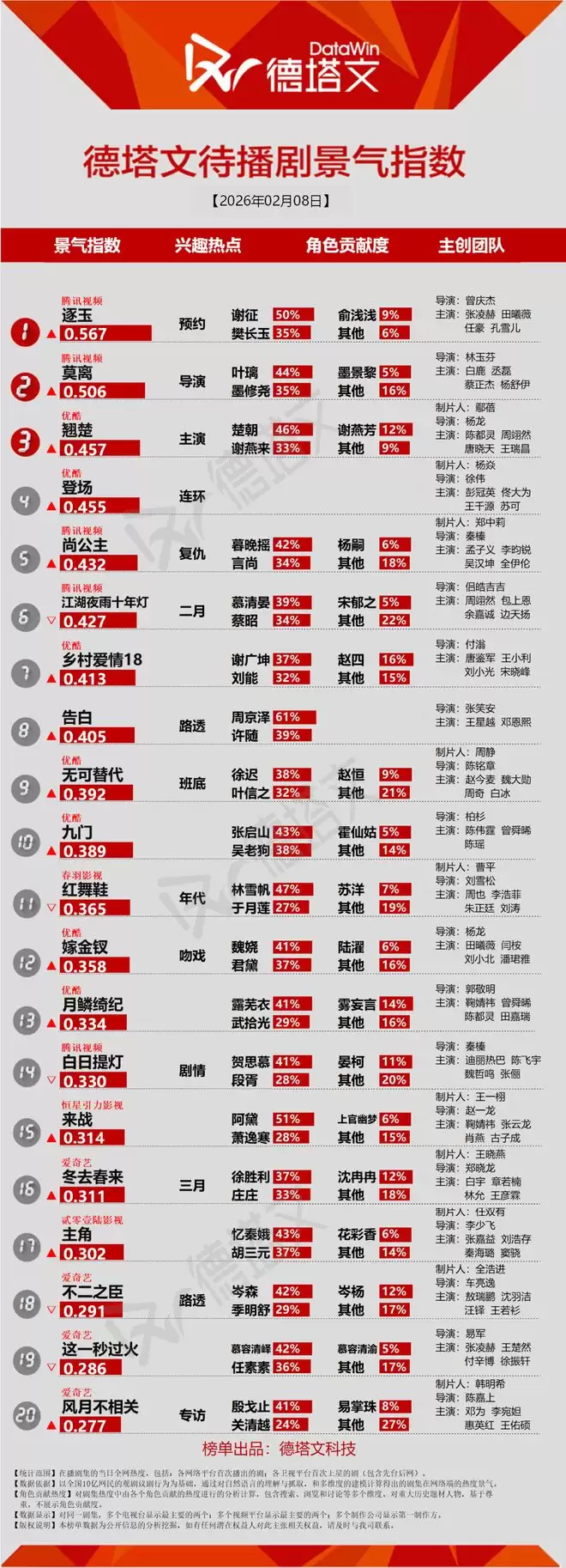 德塔文电视剧景气日报2026-02-08电视剧当日景气TOP20TOP20排名唐宫奇案(李佩仪40% 萧怀瑾22%) 生命树(白菊40% 多杰26%) 成何体统(庾晚音39% 夏侯澹3