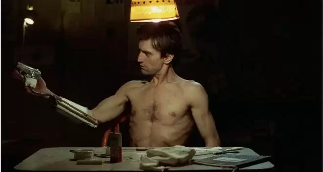 特拉维斯将自己视为能够拯救世界的英雄,这种幻觉是他试图获得在现实中被剥夺的掌控感的补偿手段。同时,影片中特拉维斯进行极端体能训练、灼烧手臂、精心调试武器的过程,实质上是在试图通过加强肉体边界来修补支离破碎的自我认同,将身体转化为一件非人的工具。