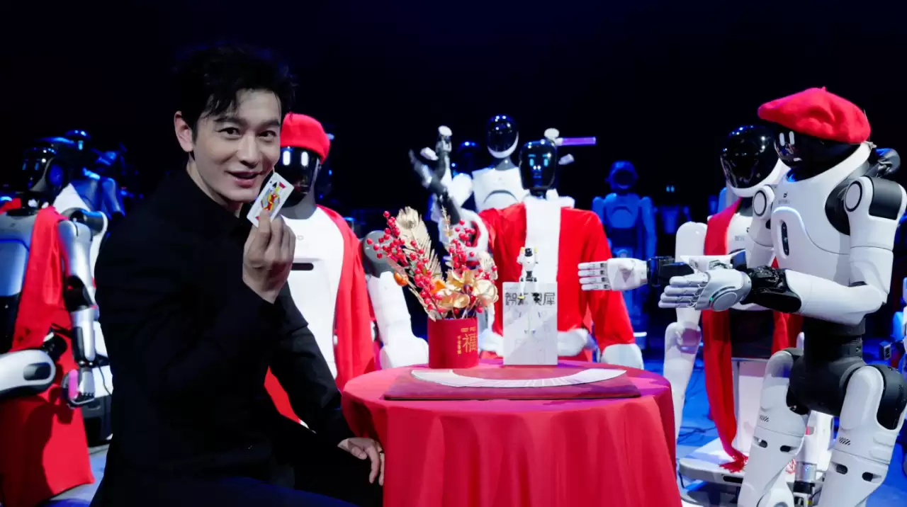 晚会由智元远征A2担任主理人,共推出了12个高水准节目:在开场舞《舞力全开》中,24台灵犀X2凭借精准的群控技术实现动作零偏差,其中一台机器人更是借助威亚完成了空中姿态展示;《武林大会》环节,数十台机器人化身“少林寺弟子”,精准复刻醉拳、棍法等传统武术招式;全球首个机器人魔术表演《超级变变变!》中,黄晓明跨界担任“见证官”,与灵犀X2、远征A2共同呈现。
