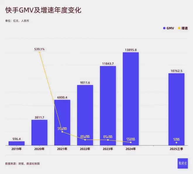 拉长时间段看,在王剑伟执掌快手商业化的第一年,快手GMV首次突破万亿,成为第五家破万亿GMV的平台。此后两年间,快手维持着稳步增长,2025年前三个季度,快手GMV已经突破万亿。