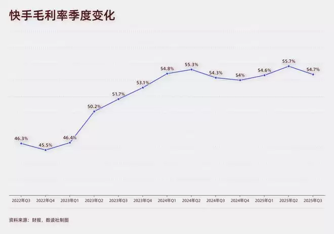 2024年、2024年,快手毛利率超过50%,这样的势头延续到2025年,三季度毛利率为54.7%。而在2024年,快手的毛利率只有44.7%。