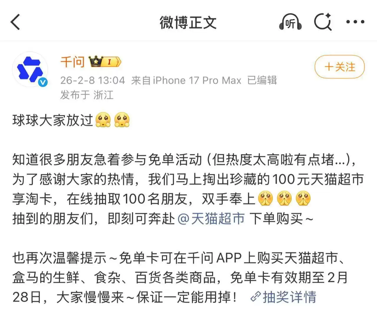 2月8日下午,千问发文:“球球大家放过”,知道很多朋友急着参与免单活动,但热度太高有点堵。同时再次提醒大家,免单卡有效期至2月28日,“大家慢慢来,保证一定能用掉!”