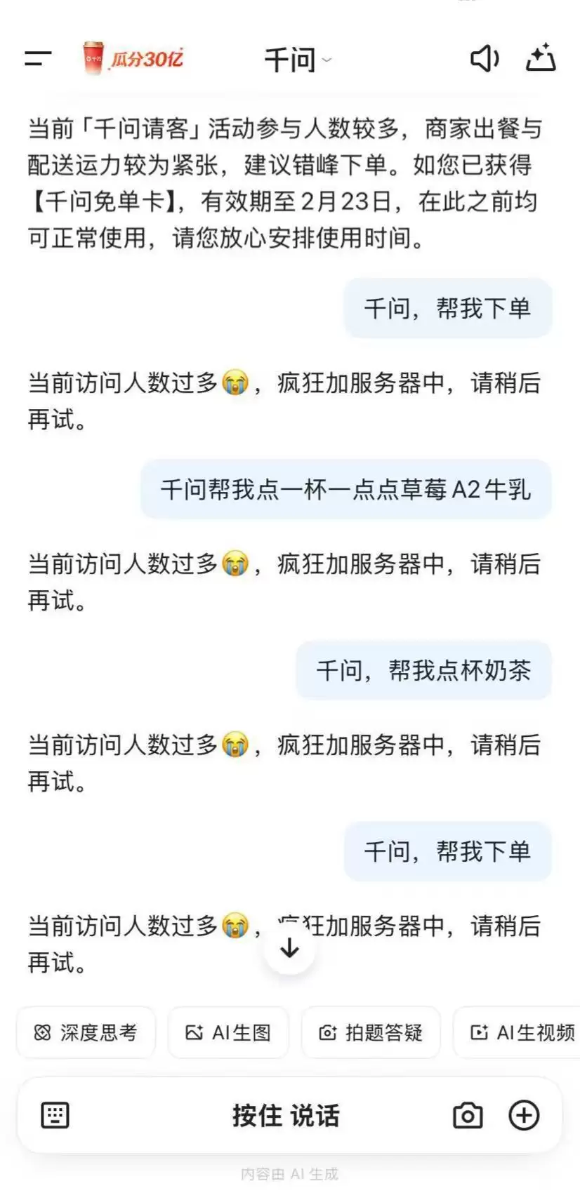 上线当天,就有不少用户反馈,活动出现服务器卡顿问题。一位武汉用户介绍,当晚,他尝试用千问下单奶茶,多次输入口令后系统均提示“当前访问人数过多,疯狂加服务器中,请稍后再试”。千问最新也在活动首日下午发帖称“今天累垮了,球球大家明天再来。”