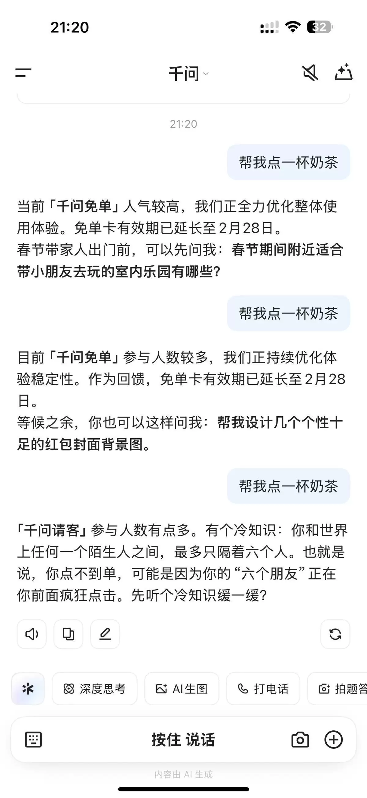 2月7日,千问最新发文:千问免单卡可以一直用到2月28号,还有21天可以用。这两天是奶茶下单高峰期,大家可以先集齐21张卡,慢慢错峰下单,保证大家的免单卡一定能用掉。另外,免单卡可以在盒马买鱼、买菜、买鸡蛋、买蛋糕、买年货;可以在千问APP里买天猫超市的酒水零食、米面粮油、家居日用、生鲜水果等。