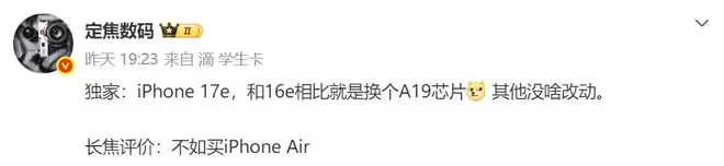 原因是核心升级几乎只有一项,那就是把芯片从A18换成iPhone 17同款的A19,其余部分大概率沿用旧模具。