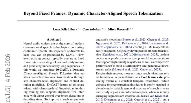 语音识别和合成技术正在快速发展,但现有技术存在一个根本问题:它们处理语音的方式就像用固定大小的盒子装各种不同大小的物品一样低效。这项由蒙特利尔康考迪亚大学、魁北克人工智能研究所和拉瓦尔大学联合开展的突破性研究发表于2026年2月的预印本论文中,论文编号为arXiv:2601.23174v2,为语音处理领域带来了革命性的解决方案。