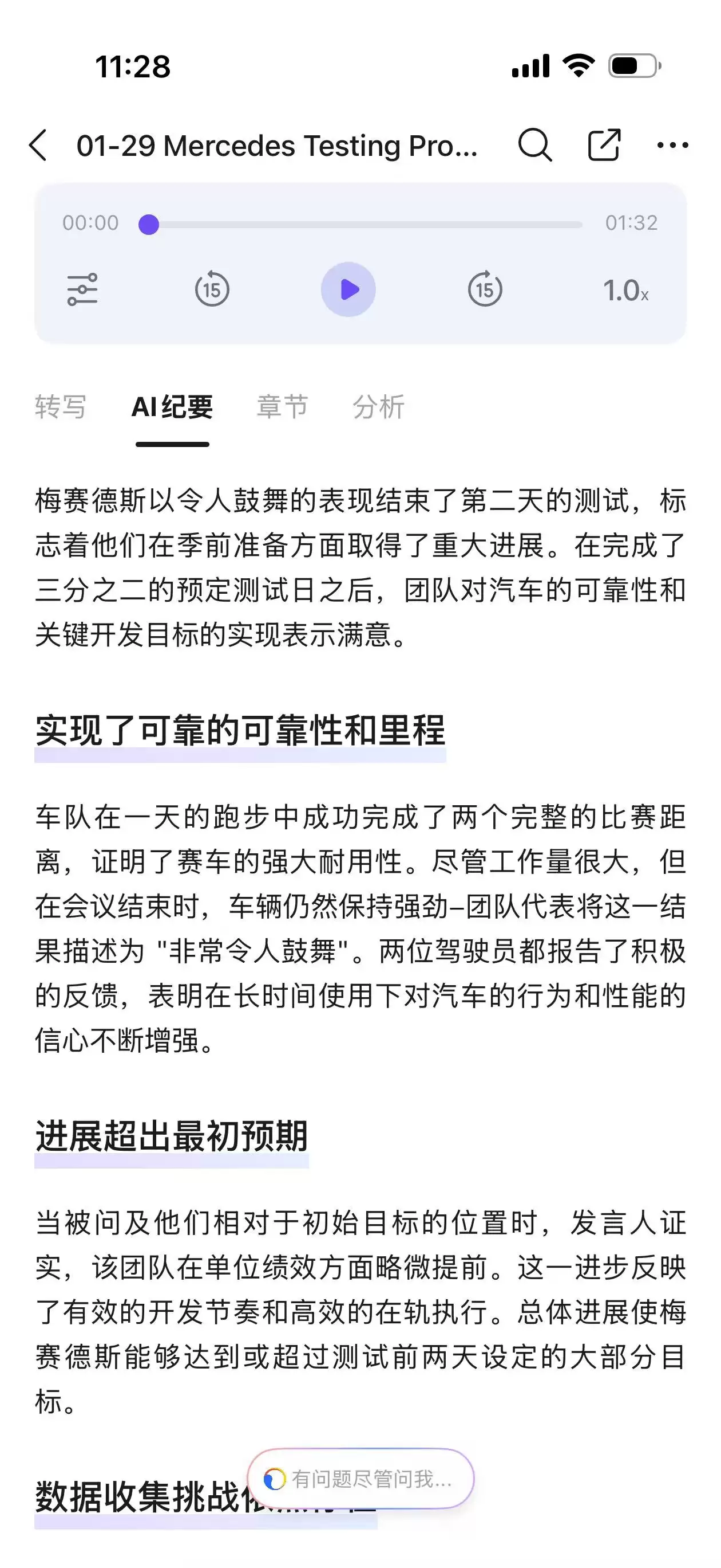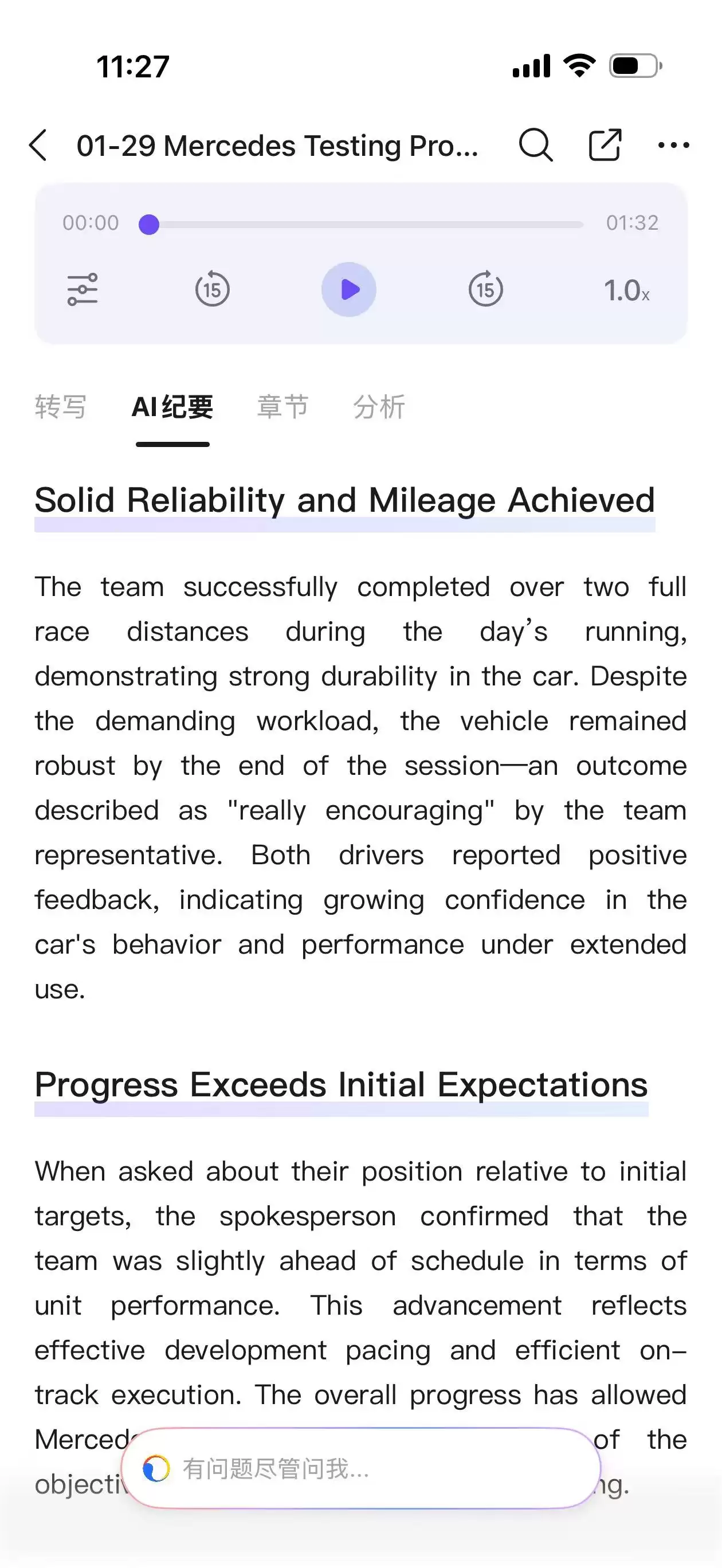翻译的话,由于买到钉钉 A1 录音卡时我已经回国,所以错过了 CES 2026 这个最佳试验场。不过前段时间 F1 车队都在巴塞罗那做私人测试,我试着用钉钉 A1 录音卡录下了各车队领队的采访。钉钉 A1 录音卡不仅可以准确识别英文,甚至还可以对英文内容直接进行 AI 整理,完了还能再翻译成中文。