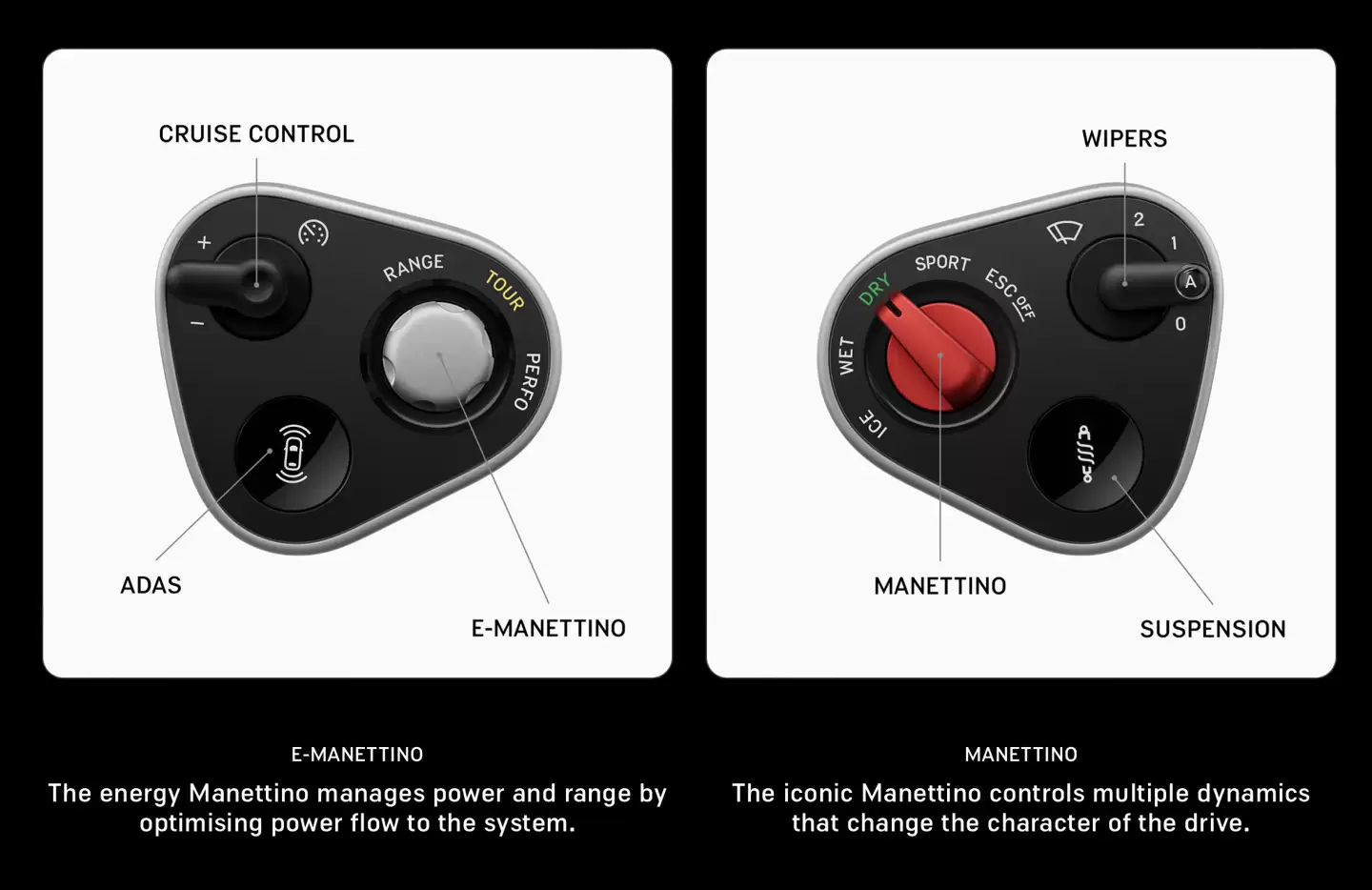 软件层面,这款车的人机交互界面秉承触感、清晰、直觉三大核心理念。设计团队优先选用实体按键,以增强人与车辆之间的互动感。方向盘采用简化的三辐结构,其设计灵感源自20世纪50-60年代的木质Nardi方向盘。整个方向盘被分为两个控制模块,类似F1赛车,相比标准法拉利方向盘轻了400克。