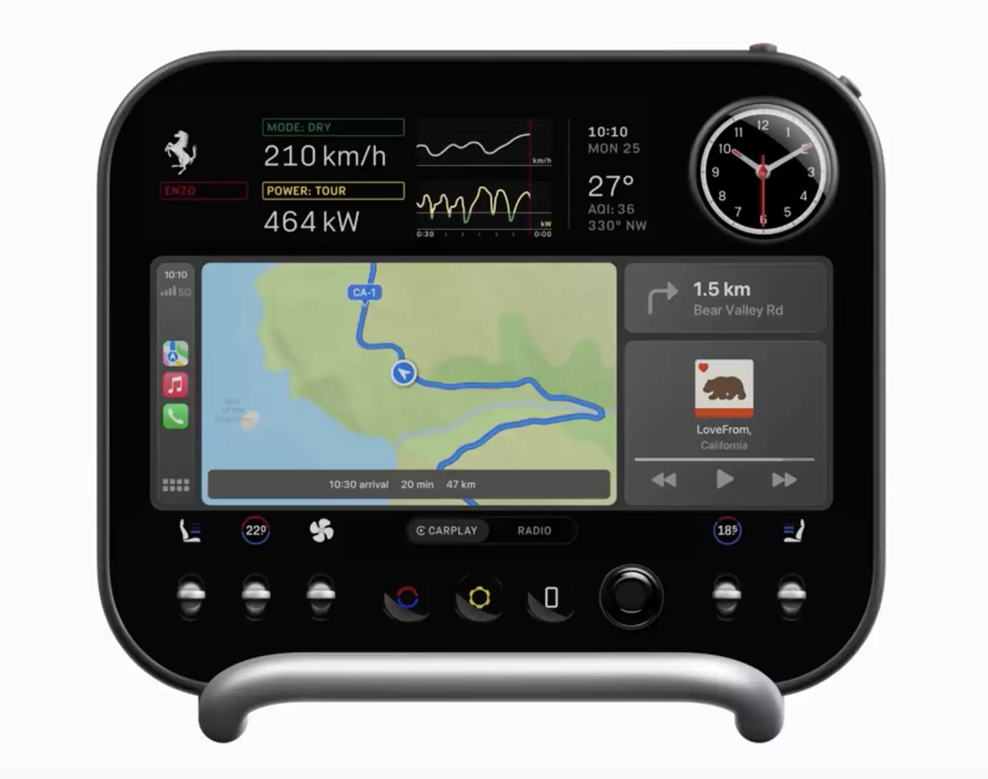 这款车的中控屏则带有球形转轴,可以自由朝向驾驶员或副驾驶。屏幕配备掌托,驾驶者无需低头即可操作。右侧带有一个球形多功能表盘,可切换时钟、计时器、指南针和弹射起步指南等功能。顶部左侧的第二块屏幕用于显示时速、功率等高级参数,而中部大屏则可显示CarPlay、空调和参数设置等信息。
