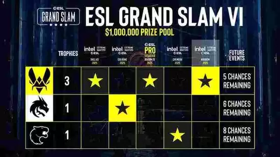 除了Vitality之外,Spirit和FURIA也分别凭借IEM科隆2025和IEM成都2025的冠军头衔,加入了大满贯的争夺战。不过,他们的追赶速度目前还远不及Vitality。