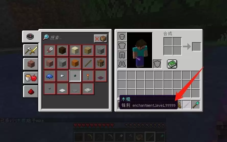 在Java版中,输入指令【/give @s minecraft:stick{Enchantments:[{id:"minecraft:sharpness",lvl:10}]} 1】即可获得一把锋利属性高达99999的木棍。然而在基岩版,目前并没有直接获取附魔武器的确切指令。
