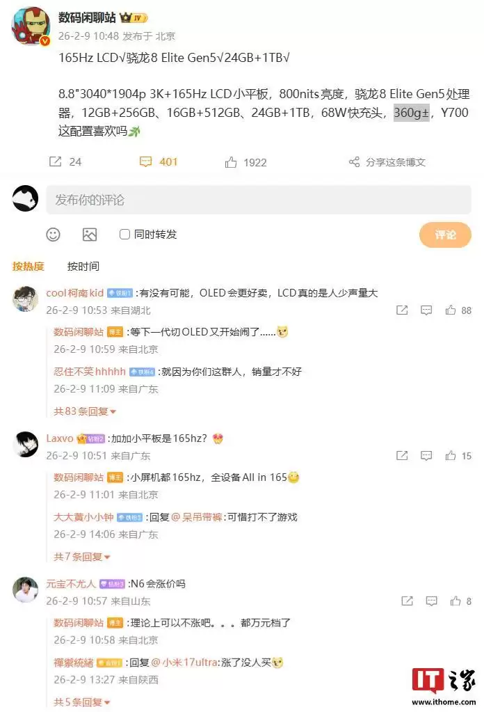 有网友评论称采用OLED屏幕或许会更具市场吸引力,该博主回复道:“等着看下一代换用OLED屏,到时候讨论热度恐怕又要起来了……”另有网友询问一加小尺寸平板的屏幕是否同样支持165Hz高刷新率,博主明确表示:“小屏机型都是165Hz,全线设备统一All in 165。”还有网友关心OPPO Find N6是否会调价,博主则坦诚回应:“理论上可以不涨吧…毕竟已经是万元档位了。”
