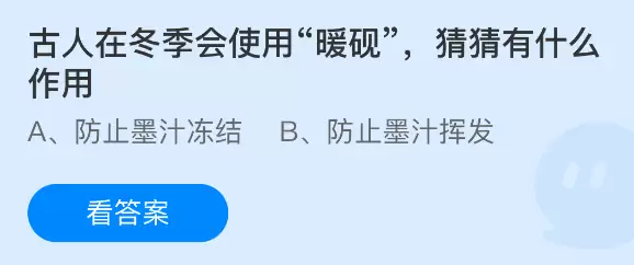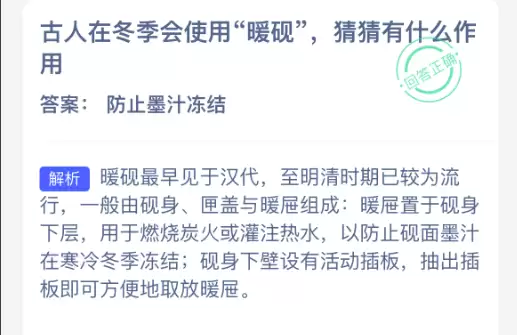 古人冬日里会用一种叫“暖砚”的文房器物,你知道它是做什么的吗?支付宝小鸡课堂开课啦!每天花一分钟答题赚饲料,喂喂小鸡就能轻松奉献爱心哦,简单又有趣!2026年2月9日蚂蚁庄园的小鸡课堂题目正确答案是【防止墨汁冻结】。原来在严寒天气里,砚台中的墨汁很容易结冰,这让书法写作变得困难。暖砚通过加热砚台,保持墨汁的流动性,使文人能够持续书写。