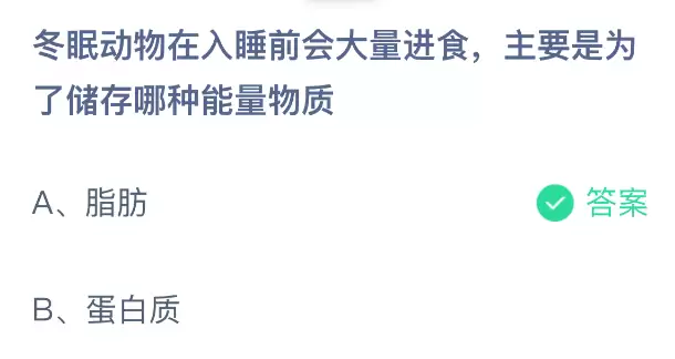 3、答案解析:冬眠动物在入睡前大量进食,主要是为了储存 脂肪 。脂肪是动物体内最高效的储能物质,单位质量所含能量远高于糖类或蛋白质,非常适合为漫长而低代谢的冬眠期提供持续能量。同时,脂肪层还具有保温、缓冲和减少摩擦的生理功能,能帮助动物抵御寒冷和减少能量损耗。