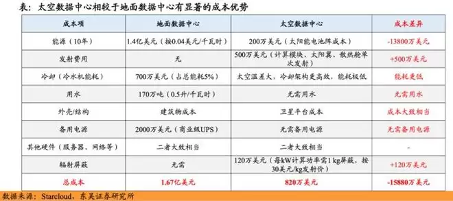 而据东吴证券的测算,太空数据中心的全生命周期成本显著低于地面设施,以40 MW 集群运行10年为例,地面方案的总运营成本约为1.67亿美元,而采用太空算力仅需约820万美元,10年可节省约1.59亿美元。