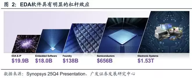 作为集成电路产业链当之无愧的金字塔塔尖,EDA处于产业最上游核心位置,是连接设计、制造、封测各环节的关键纽带。2024年全球EDA+IP的市场规模近200亿美元,却撬动着超6000亿美元的半导体产业,1.5万亿电子信息产业规模,进而支撑起超过数十万亿美元的数字经济。