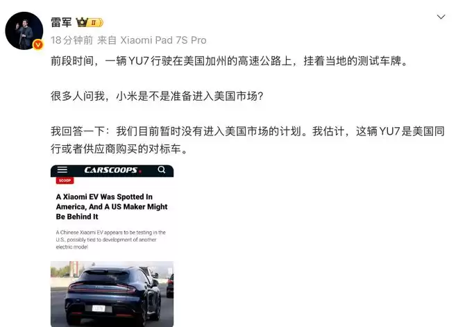 2月10日,雷军在微博发文透露,此前有一辆小米YU7在美国加州高速公路上行驶,悬挂着当地的测试车牌。针对外界猜测小米是否准备进入美国市场,他澄清称小米汽车目前暂无进军美国市场的计划,并推测该车辆可能是美国同行或供应商购买的对标测试车。