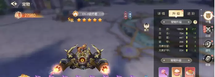 所有已获得的宠物都能在宠物界面中查看,并在这里进行后续的培养操作,主要包括升级、升阶和进化三个方面。