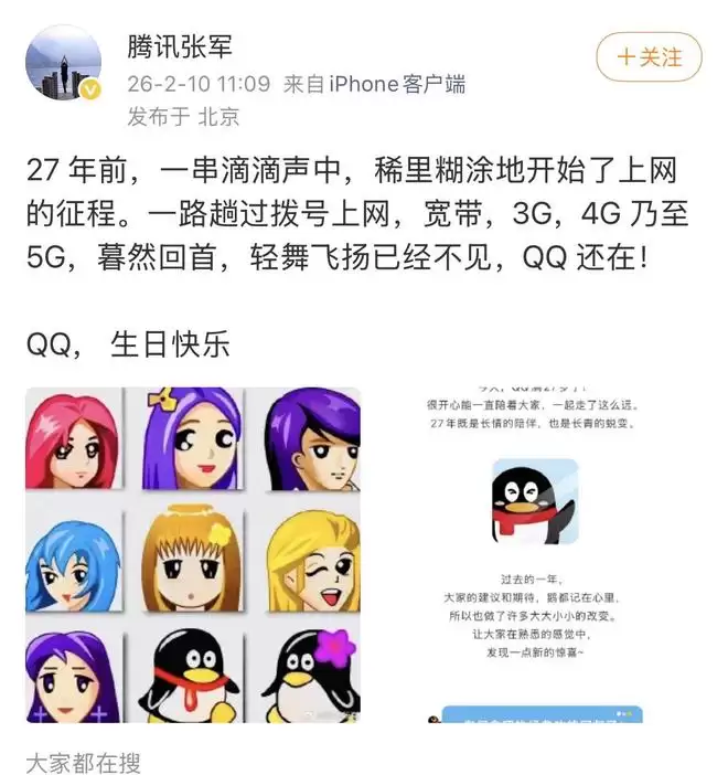 今天,腾讯公关总监张军发文庆祝QQ上线27周年: