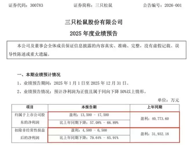 近期,三只松鼠发布2025年度业绩预告,公司预计2025年度归属于上市公司股东的净利润为1.35亿元至1.75亿元,同比下降57.08%—66.89%。