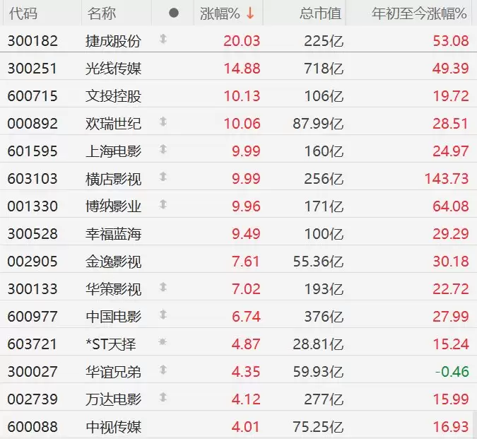 2月10日,A股影视板块强势上扬。多家公司股价表现亮眼,其中捷成股份以20%涨幅收于涨停,光线传媒上涨近15%,文投控股、欢瑞世纪、上海电影、横店影视、博纳影业等均收获10%的涨停板。幸福蓝海涨幅超过9%,金逸影视、华策影视涨幅超过7%,中国电影涨幅超过6%。尤为值得一提的是,横店影视股价在此轮行情中创下了历史新高。