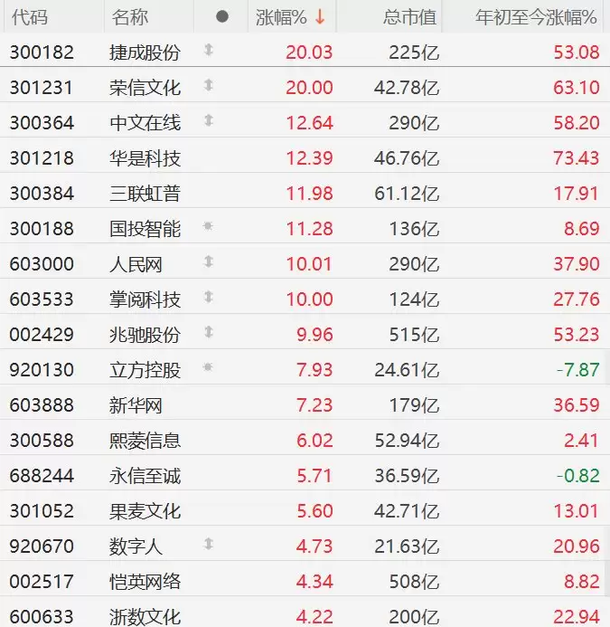 其中,中文在线在昨日20CM涨停后,今日盘中再度逼近20CM涨停;此外,捷成股份、荣信文化、三六零、人民网、掌阅科技、新华网等均表现强势。