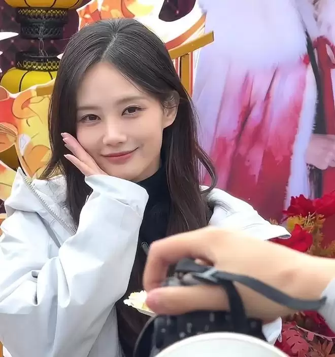 上身穿的是剧组统一的灰色剧宣服,衣服正面印着 “金枝” 两个字,字体简洁大方,没有多余的装饰。
