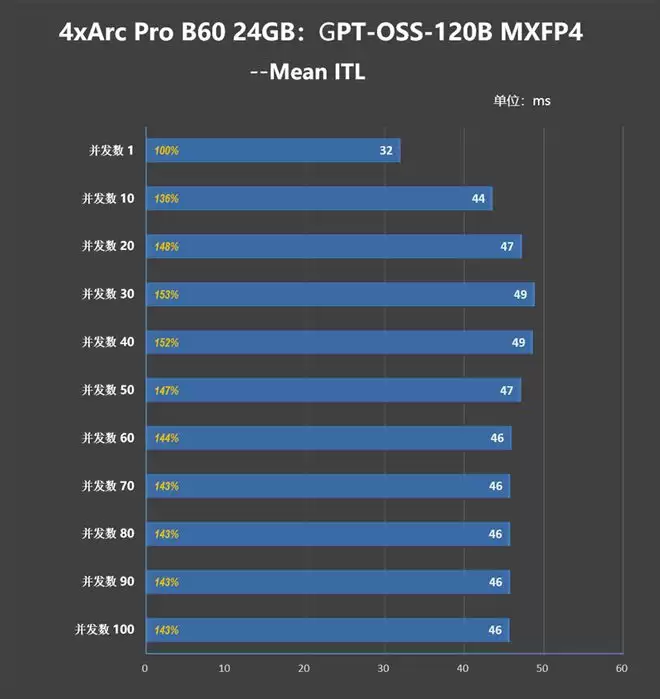 这是并发数为1的测试成绩日志,请求成功率 100%,在处理 120B 这种超大规模模型时,100 个请求全部成功且无一报错,说明4卡 Arc Pro B60 + MXFP4运行测试时非常稳定。