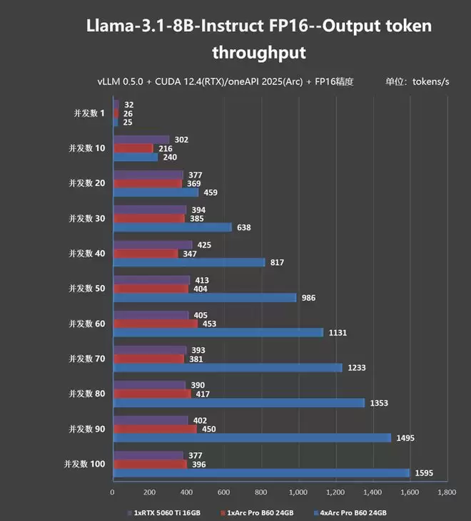 Llama-3.1-8B的显存需求只有7GB左右,因此不仅可以对Arc Pro B60 24GB进行单卡、双卡、4卡测试,我们还能测试桌面版RTX 5060 Ti 16GB的推理性能并与之进行对比!