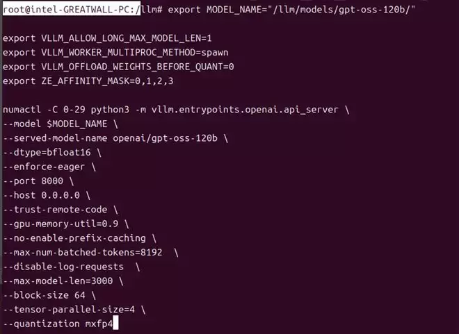 我们将GPT-OSS-120B模型下载至容器的llmmodels目录下,并开启vLLM OpenAI API服务,具体参数如下: