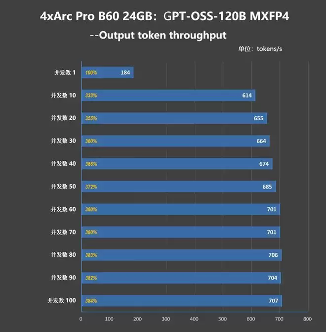 当并发数达到60之后,4张Arc Pro B60 24GB的吞吐量超过了701 tok/s,能满足千人同时在线聊天。