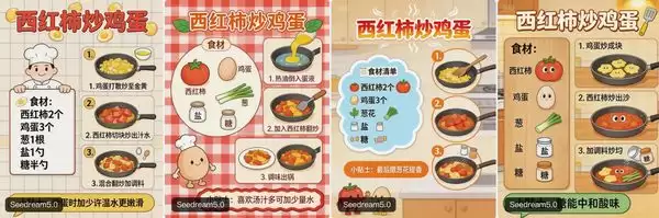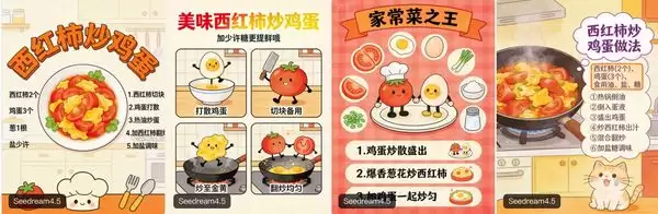 在比较Seedream 4.5和Seedream 5.0时,智东西上传的提示词是“帮我生成西红柿炒鸡蛋的菜谱,卡通风格”。相比之下,Seedream 5.0的整体排版、架构设计会更为美观。