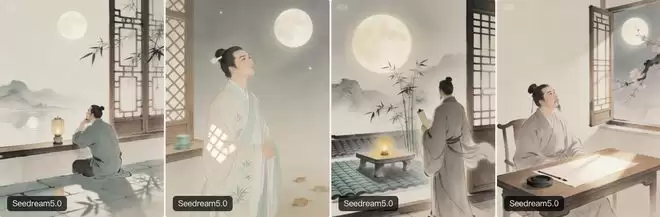 第一个提示词是“为《静夜思》生成古诗插图”,可以看到生成的结果中人物“举头望明月”这一关键元素都没有缺失,还附上了人物在月光下的影子等,但原诗中的“床前”等没有在图片中涉及到。