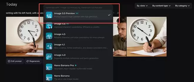 智东西还比较了Seedream 5.0与Nano Banana Pro的生成效果。一个超难提示词为“生成一个用左手写字的人,背景有一个显示5:25的模拟时钟”,Seedream 5.0与Nano Banana都失败了,要么是拿笔的手不对,要么是背景的钟表时间不对。