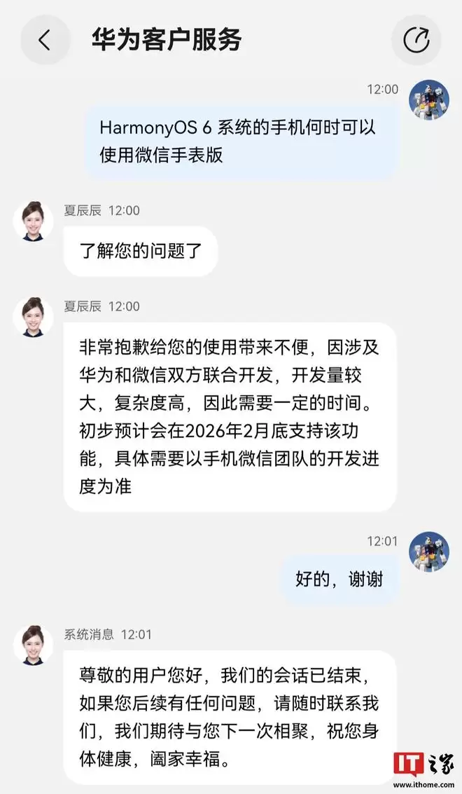 针对搭载HarmonyOS 6系统的手机何时能使用微信手表版这一问题,IT之家今日询问了华为客户服务,对方表示: